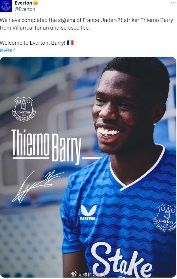 官方:埃弗顿宣布从比利亚雷亚尔签下了蒂尔诺-巴里,这名22岁的前锋签下了一份4年合同。