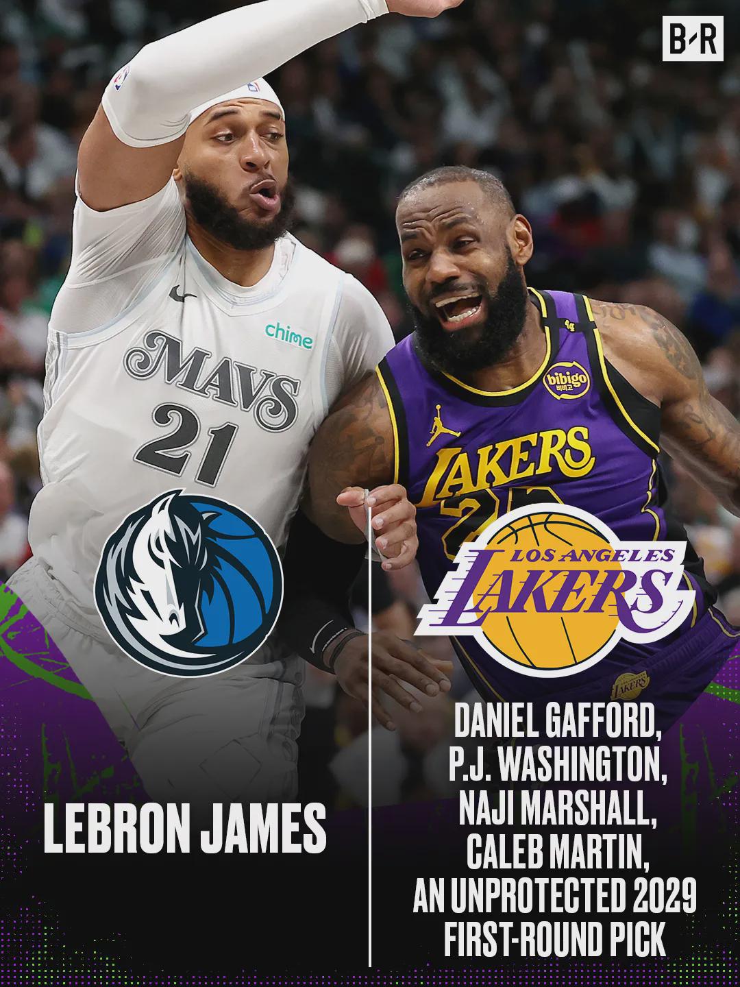 达拉斯独行侠送出加福德和PJ华盛顿等筹码,换取勒布朗詹姆斯。让勒布朗詹姆斯搭档独行侠三大状元凯里欧文、安东尼戴维斯和弗拉格,组建一个前所未有的四状元组合,创造NBA历史。最重要的是,搭档这三人,真的有可能让勒布朗詹姆斯获得个人职业生涯第五冠。