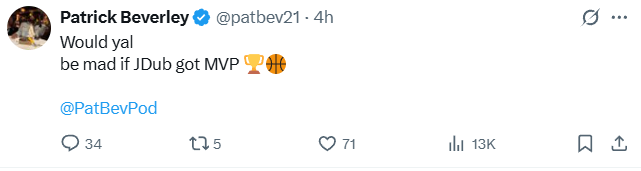 此役,杰威得到全场40分6篮板4助攻。赛后,前NBA球员贝弗利更新社媒并发起灵魂拷问:“如果最后FMVP得主是杰威,你们会生气吗?”