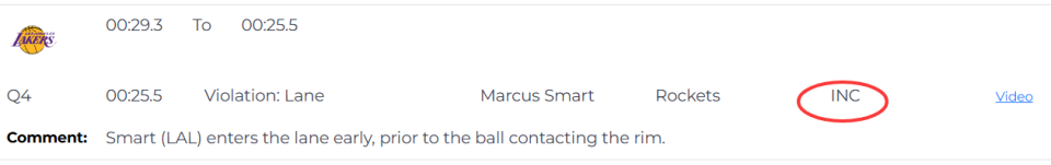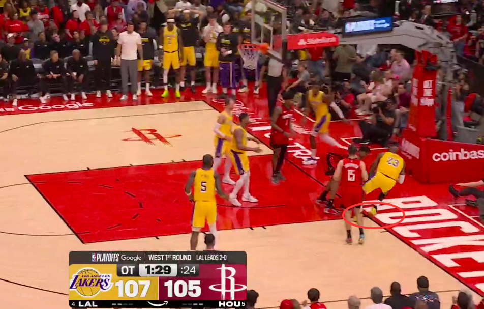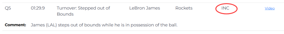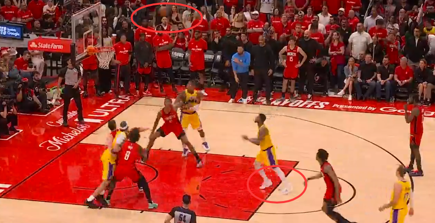 第二次漏判发生在距离加时赛结束还有1分29秒。裁判报告指出,詹姆斯在与火箭球员拼抢时拿到球,但这时他的脚已经出界,裁判没有响哨。虽然这一球理论上是湖人获利,但詹姆斯救球回来,火箭又得到球权。这一漏判的影响,对比赛来说没有上一次那么明显。