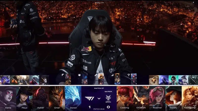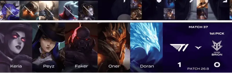 T1选用:Doran塞恩、Oner皇子、Faker冰鸟、Peyz女警、Keria莫甘娜