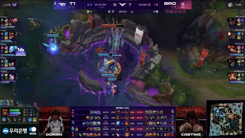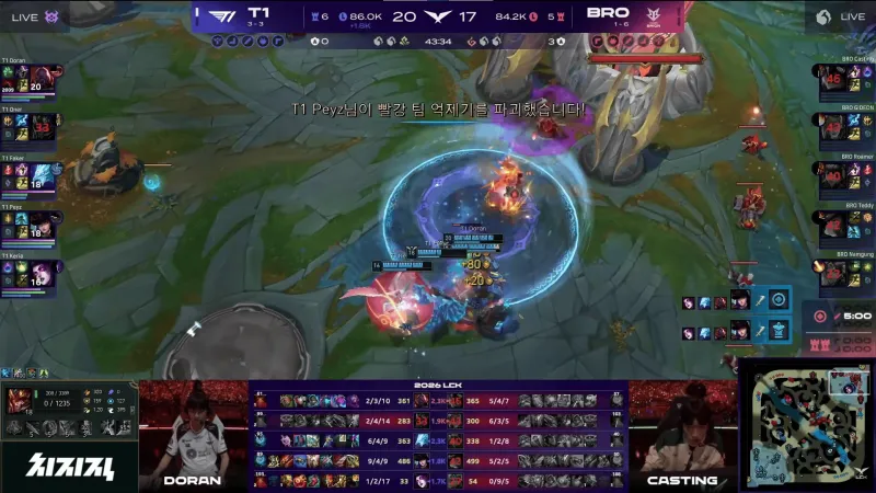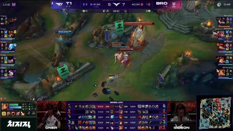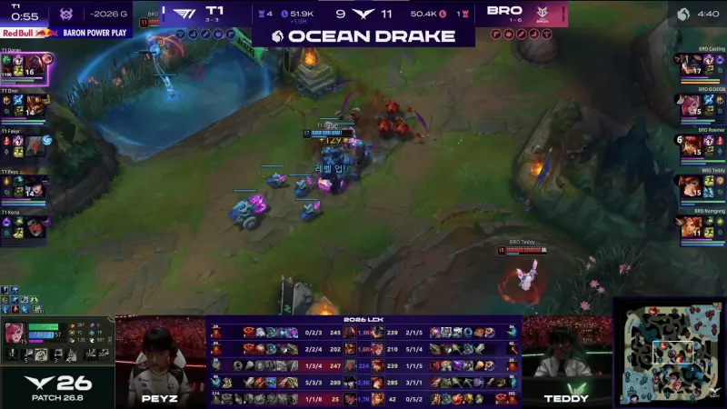 比赛第24分钟,BRO被逐个击破,T1先后0换4拿下大龙。