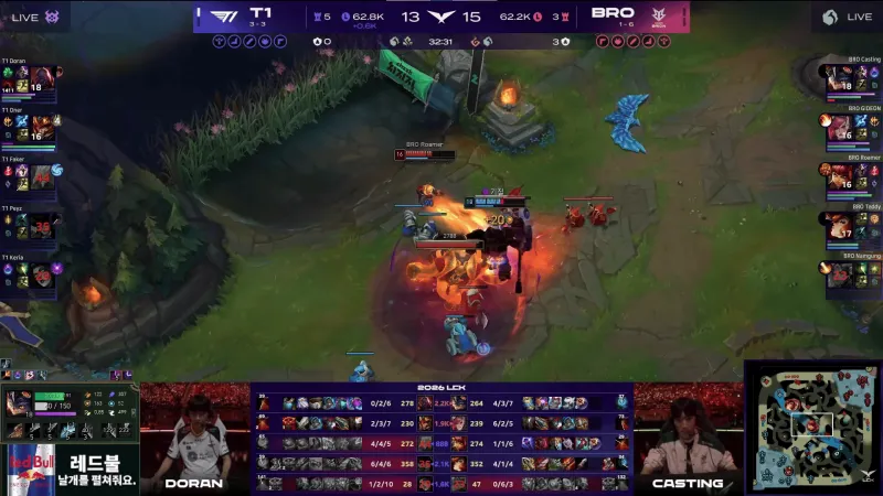 比赛第26分钟,BRO反击打出1换3打退T1大龙推进。