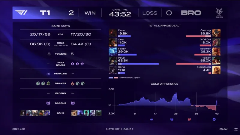 虎扑04月25日讯 【GAME2】T1蓝色方、BRO红色方